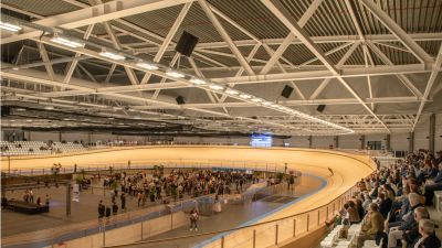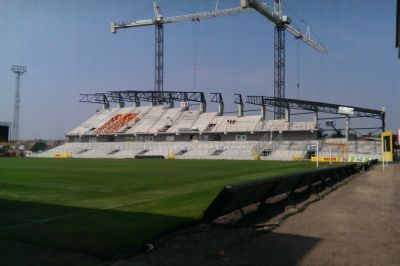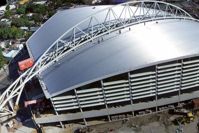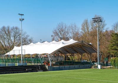 • Tekst: <p>Ayant pour fond une grande mosaïque rouge et noire, l’architecte trace une ligne ondulée apposée sur une série de fines petites pattes ; un abri recouvrant une tribune existante de 50 m de long. Le dessin est tout simple : une tôle de 15 mm d’épaisseur et 45 colonnes de support en acier de 55 mm de diamètre sont disposés de façon plus ou moins aléatoire sur les trois gradins que comportent la tribune. La courbe a été optimisée pour éviter le flambement dû à la poussée latérale causée par le poids des tôles. Celles-ci ont été cintrées en atelier et assemblées sur place en dix parties de cinq mètres sans que les fixations entr’elles ne soient visibles, grâce à l’utilisation de boulons à tête fraisées enfoncés dans les tôle qui en leurs extrémités se chevauchent à mi-épaisseur. Les colonnes doivent soutenir la toiture à la fois verticalement et horizontalement. Comme les 15 colonnes de la rangée de devant se trouvent approximativement au milieu de l’auvent qui fait 5 m de profondeur, elles en supportent presque tout le poids. En revanche, les colonnes situées à l’arrière, qui ne portent qu’une faible proportion de la charge, réagissent de manière plus rigide aux poussées horizontales et font office de contreventements.</p>