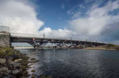 Tekst: L'ancien pont levant entre Wormer en Wormerveer au nord d'Amsterdam, a été entièrement démoli et remplacé par un nouveau pont en acier avec des approches en béton. Grâce à cette nouvelle conception, la voie navigable a été élargie de 12 à 16,5 m et la hauteur libre de passage a été portée à 2,88 m. Le pont est constitué de deux tours de 15x3 m (22 tonnes chacune), un tablier mobile de 23x10 m (95 tonnes), deux tabliers mobiles pour la circulation lente de 21x7 m (35 tonnes chacun), un balancier de 25x11 m (345 tonnes, dont 88 tonnes de ballast de réglage) et un système d'entraînement central avec des roues Panama dans le sous-sol du pont. Le tout en S355 et classe de suivi CC2. La complexité du nouveau pont réside principalement dans sa silhouette élancée. Le pont dispose de deux parties séparées pour les cyclistes et les piétons, avec à la fois un arc et une courbe en S. Les tours de levage et le balancier sont également dotés de bords et d'angles arrondis (r = 100 mm). La hauteur de construction des travées était limitée en raison du profil de l'espace libre - en dessous et au-dessus, ce qui classe le pont dans la catégorie 'très élancé'. C'est pourquoi, en raison d'un rapport de centre de gravité défavorable, il a été décidé d'utiliser un remplissage combiné en acier et en béton lourd dans le contrepoids. Composé de trois parties distinctes, chacune avec ses propres appuis, le pont compte au total huit axes alignés. La conception structurelle et électrique a également pris en compte la possibilité d'une collision : il est possible de détacher le pont cyclable (de le rééquilibrer) et de le rendre pivotant en prenant les mesures appropriées.