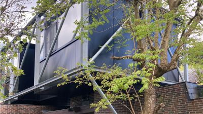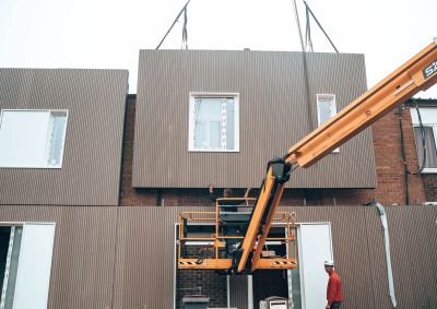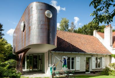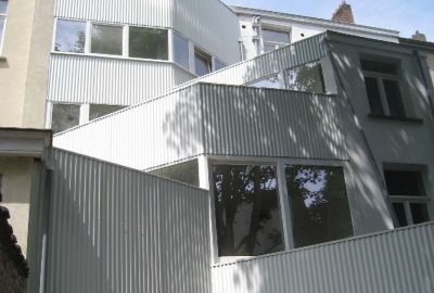 • Tekst: <p>Au centre de Bruxelles, cette habitation privée s’est vue radicalement transformée grâce à l’ajout en façade arrière d’une extension en acier (4 x 4,5 x 6 m haut ; ± 4500 kg) conçue d’une seule pièce avec escalier intégré. <br />La préfabrication en atelier (3 semaines + 1 semaine de mise en peinture) a permis d’installer le nouveau module en 3 heures seulement. <br />Cette annexe se compose d’une simple tôle d’acier de 5 mm d’épaisseur, raidie par un ensemble de 5 portiques de 20 mm d’épaisseur pour 100 mm de large. Cette structure épurée permet d’optimaliser l’espace généré par l’intervention. Avec mise en peinture en atelier, l’acier devient la signature visuelle et la peau intérieure du projet. Par ailleurs, la coque en acier est étanche et sert donc de pare-vapeur naturel vis-à-vis de l’isolation extérieure qui l’entoure totalement. L’acier étant recyclable à 100 %, on peut imaginer que le module puisse à l’avenir être extrait du projet et recyclé intégralement.</p>