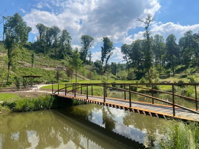 Tekst: Le pont reliant les ruines du château Ter Elst à Duffel a été officiellement inauguré en 2025 par la Fondation Kempens Landschap et la commune de Duffel. Ce nouveau pont piétonnier relie l'île du château au Muggenbergpark et au chemin de halage le long de la Nete, et fait également office de voie d'évacuation sécurisée. L'inauguration marque une étape importante dans la restauration des ruines, qui devrait être entièrement terminée à l'horizon 2026. Le site restauré sera destiné à accueillir des événements, et le nouveau pont viendra renforcer cette fonction en améliorant l'accessibilité. Le pont de 20 m de long est fabriqué en acier auto-patinable. Il a été transporté en une seule pièce et assemblé à l'aide d'une grue de montage.