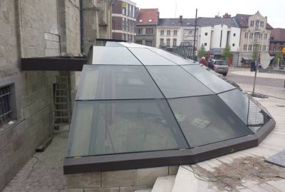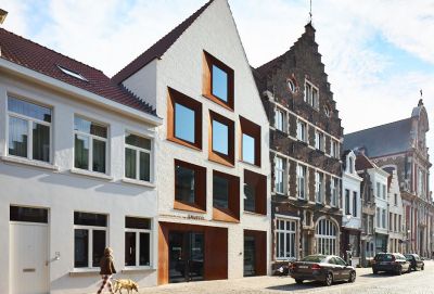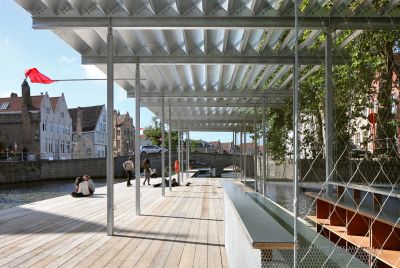 • Tekst: <p>Le pavillon d’accueil du musée Gruuthuse (Bruges) fait revivre la cour ancestrale située entre l’église Onze-Lieve-Vrouw, le palais Gruuthuse et le musée Oude Steen, renforçant l’aspect historique du site. <br />Dans ce contexte d’une valeur patrimoniale exceptionnelle, le pavillon se profile comme une construction contemporaine - un exosquelette d’acier et de verre - tout en faisant écho à l’expression formelle (néo)gothique des monuments environnants. <br />Il est conçu comme une structure métallique pliée, selon le principe structurel de la ‘folded plate’. Les plans du toit sont en acier plat de 6 mm et les colonnes en acier plat de 8 mm. Les plus grandes surfaces inclinées de l’auvent sont renforcées localement avec des ailettes soudées de 10 mm d’épaisseur. Les semelles IPE 100 fournissent la rigidité nécessaire dans les plans verticaux frontaux. Les détails minutieux de la structure métallique renforcent l’expression architecturale.</p>