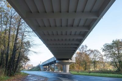 Tekst: L’ouvrage OA894 constitue un pont de franchissement majeur au-dessus de l’autoroute A1 dans le cadre du prolongement de la ligne n°1 du tramway luxembourgeois vers l’aéroport du Findel. Il s’agit d’un ouvrage mixte acier-béton, composé de deux travées hyperstatiques de 45 m et 63 m, pour une portée totale de 108 m. L’implantation répond à des exigences fortes en matière de fonctionnalité ferroviaire, de contraintes autoroutières et d’intégration dans l’environnement. Le tablier supporte deux voies de tramway ainsi que deux pistes de service, présentant une largeur utile totale de 7,27 m. L’ouvrage OA894 incarne un exemple remarquable de synergie entre ingénierie structurelle avancée et design architectural intégré. Sa charpente métallique fermée assure une robustesse optimale pour un franchissement ferroviaire en courbe, tandis que son habillage en aluminium confère à l’ensemble une légèreté visuelle et une signature contemporaine. Pensé pour durer, l’ouvrage s’inscrit avec élégance dans un environnement paysager délicat, à proximité immédiate d’une zone Natura 2000.