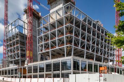 <p>Concrètement, une infrastructure en acier a été suspendue au squelette de la base en béton et une structure en acier impressionnante a été ajoutée au nord du bâtiment pour soutenir les nouvelles terrasses. Ces ossatures en acier sont devenues le support des différents éléments de façade : lamelles, plafonds, passerelles et revêtements de façade.</p>