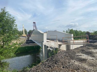 Tekst: Les 2 anciens ouvrages, franchissant la Vesdre à Nasproué et La Raye à Verviers, fortement sinistré par les inondations de 2021, sont remplacés par des nouveaux ouvrages composés de 2 poutres en caisson trapézoïdal à hauteur variable. Le tablier central est une dalle en béton coulée sur prédalles d’une largeur utile de 4 m. Ces 2 ouvrages ont été réalisés dans un marché unique de par leur analogie de conception et de dimensions. Les quartiers desservis par ces ouvrages fortement enclavés nécessitaient un timing de chantier avec coupure du passage limité. La conception de ces ponts entièrement préfabriqués a permis de limiter la période de coupure entre la pose de l’ouvrage et la mise en service à moins d’un mois et demi. La structure en acier possède une portée principale de 21 m et 26 m respectivement, sans pile intermédiaire augmentant ainsi la section hydraulique de la rivière en cas de future crue, pour un poids de 32 et 40 tonnes environ. De plus, tous les impétrants ont été intégré dans le tablier et les caissons structurels d’un part pour une meilleure intégration esthétique de l’ouvrage et d’autre part pour protéger ces réseaux en cas de future crue.