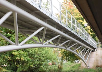 Tekst: D’une portée de 22 m pour 4 m de large, cette passerelle à Verviers s’articule autour d’un profilé reconstitué soudé (PRS) à hauteur variable qui délimite deux cheminements, un cheminement direct et une promenade en arc. Le support du platelage s’étend quant à lui en porte-à-faux de part et d’autre sur cette poutre considérée comme la colonne vertébrale de la passerelle. La torsion engendrée par des chargements dissymétriques est reprise par un arc déconstruit formé des tubes latéraux : l’un rectiligne assure le rôle de tirant et l’autre selon la forme de l’arc.
