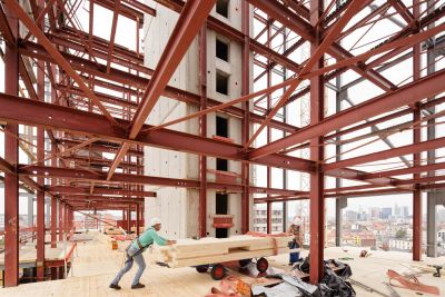 • Tekst: <p>Sur la Noorderlaan à Anvers, un immeuble de bureaux d’une longueur d’au moins 100 m a été équipé d’un étage supplémentaire avec des espaces de bureaux. Cette structure a été conçue comme une interprétation du contexte industriel existant. La structure se compose de portiques métalliques fins qui, avec leurs formes différentes, créent trois grands toits légèrement en pente, en combinaison avec des panneaux CLT. L’interaction entre le bois et l’acier - pour un poids total de 37 tonnes - est un choix idéal, grâce auquel les fermes métalliques peuvent être ancrées dans la structure en béton existante. <br />La nouvelle structure de plancher se compose de poutres métalliques sur lesquelles une tôle métallique trapézoïdale a été posée comme sous-couche pour la finition en OSB et linoléum. <br />La menuiserie extérieure est conçue comme un mur-rideau métallique (26 m2), où les profilés verticaux traversent le bardage de façade pour en souligner le rythme. Les portiques sont ignifugés grâce à un enduit.</p>