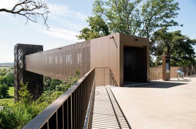 Tekst: La nouvelle structure d’ascenseur avec sa passerelle piétonne à Hesperange au Grand-Duché relie le centre du village au plateau Holleschbierg et constitue une initiative clé en faveur de la mobilité douce et l’accessibilité universelle. La tour d’ascenseur, haute de 35 m, précédée d’une place publique avec mobilier urbain, local à vélos et toilettes publiques, est construite autour d’un noyau en béton armé, complété par un escalier à plusieurs volées et quatre colonnes en acier galvanisé. Une passerelle piétonne en acier de 38 m de long, conçue comme une structure à travée unique, survol le versant boisé sans appuis intermédiaires et se raccorde aux cheminements existants menant au centre sportif. Les façades métalliques perforées de la tour et de la passerelle offrent des vues variées et confèrent à l’ensemble une forte identité architecturale. L’acier régional, la préfabrication, les assemblages entièrement vissés ainsi que la possibilité de rééquipement garantissent durabilité et pérennité de l’ensemble. L’ouvrage allie fonctionnalité et respect du paysage devenant ainsi un projet d’infrastructure emblématique.