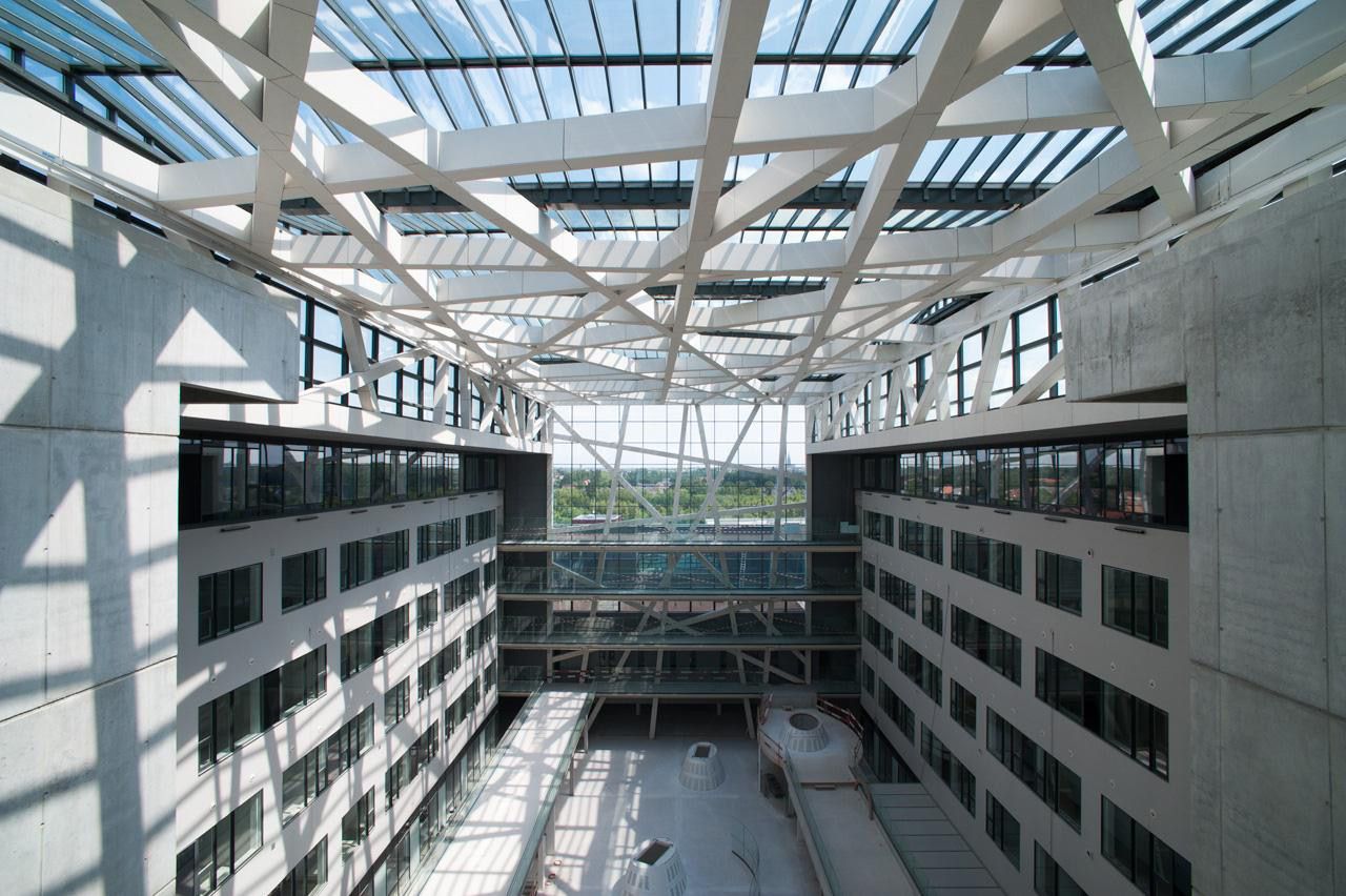 Le nouvel hôpital est constitué de deux grandes ailes latérales en T avec un bloc arrière et un atrium central comme cœur du site. Cet atrium est constitué d’une structure de 370 tonnes de 21 x 68 m et d’une hauteur de 28 m, l’ossature pour les structures en verre de la toiture et des murs. De ce hall d’entrée, avec toiture en verre, ascenseurs panoramiques et accueil émane l’atmosphère d’un hôtel. Tous les autres bâtiments sont raccordés à ce cœur en acier.