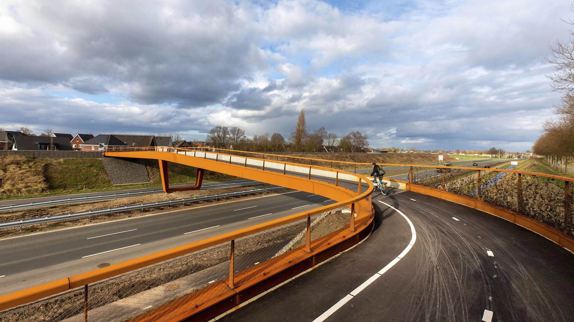 Les concepteurs d'une passerelle pour vélos et piétons de 55 m de long au Laarveld à Weert (NL), ont opté pour un tablier élancé entre deux poutres de rive qui dépassent du tablier. Cela permet de maintenir le tablier aussi bas que possible et de minimiser la différence de hauteur que les cyclistes doivent franchir. Les poutres caissons composées diminuent en hauteur, en suivant le diagramme des moments. Le tablier est constitué de nervures en acier auto-patinable, surmontées d'un platelage. Le support en forme de V est également en acier auto-patinable.