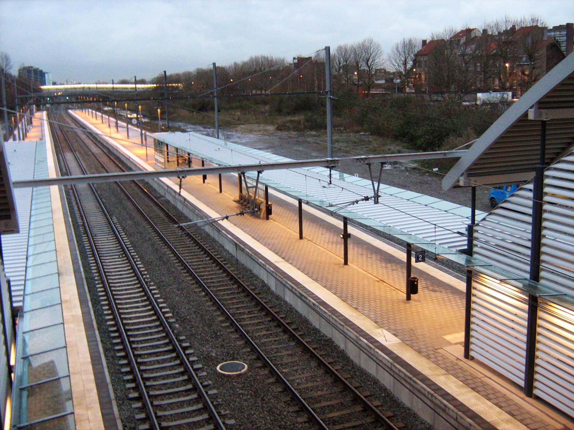 La réouverture de la Gare de l’Ouest au trafic voyageurs en décembre 2009 s’est faite dans le contexte de la réalisation d’un nœud intermodal complet. Le programme de la halte Infrabel comprend essentiellement la réalisation de deux quais de 270 m de long avec un auvent de 50 m de long. Compte tenu de la facilité de montage, des larges possibilités de préfabrication (avec un temps de mise en œuvre limité), de la souplesse d’adaptation aux divers cas de figures rencontrés dans le cadre du RER, les structures des auvents et des cages d’ascenseurs vitrées ont été réalisées en charpente métallique en acier galvanisé brut, à l’exception de certains éléments laqués (notamment colonnes tubulaires, structure d’ascenseurs, poteaux d’éclairages) dont la teinte permet de faire le lien avec les structures laquées gris foncé du bâtiment.