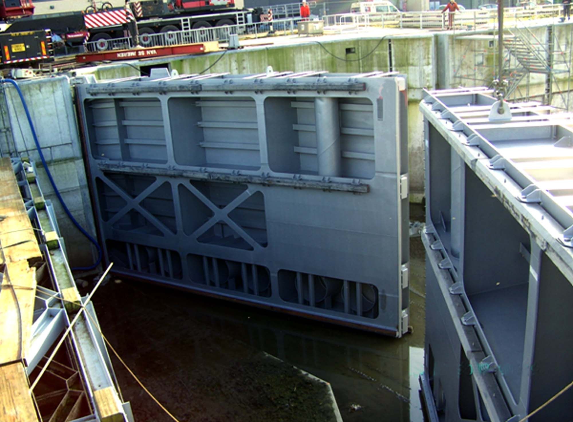 Le complexe d’écluses d’Evergem, près de Gand, est situé sur l’une des voies navigables les plus fréquentées de Belgique. Afin de permettre un trafic sûr et fiable, aussi bien pour le transport que pour la navigation de plaisance, les autorités ont décidé de moderniser les infrastructures existantes. Une partie de la rénovation concerne les 12 portes d’écluses en acier, de type busquées, qui intègrent des caissons. Chaque porte a une hauteur de 8,4 m, une largeur de 14,1 m et pèse 62 tonnes.