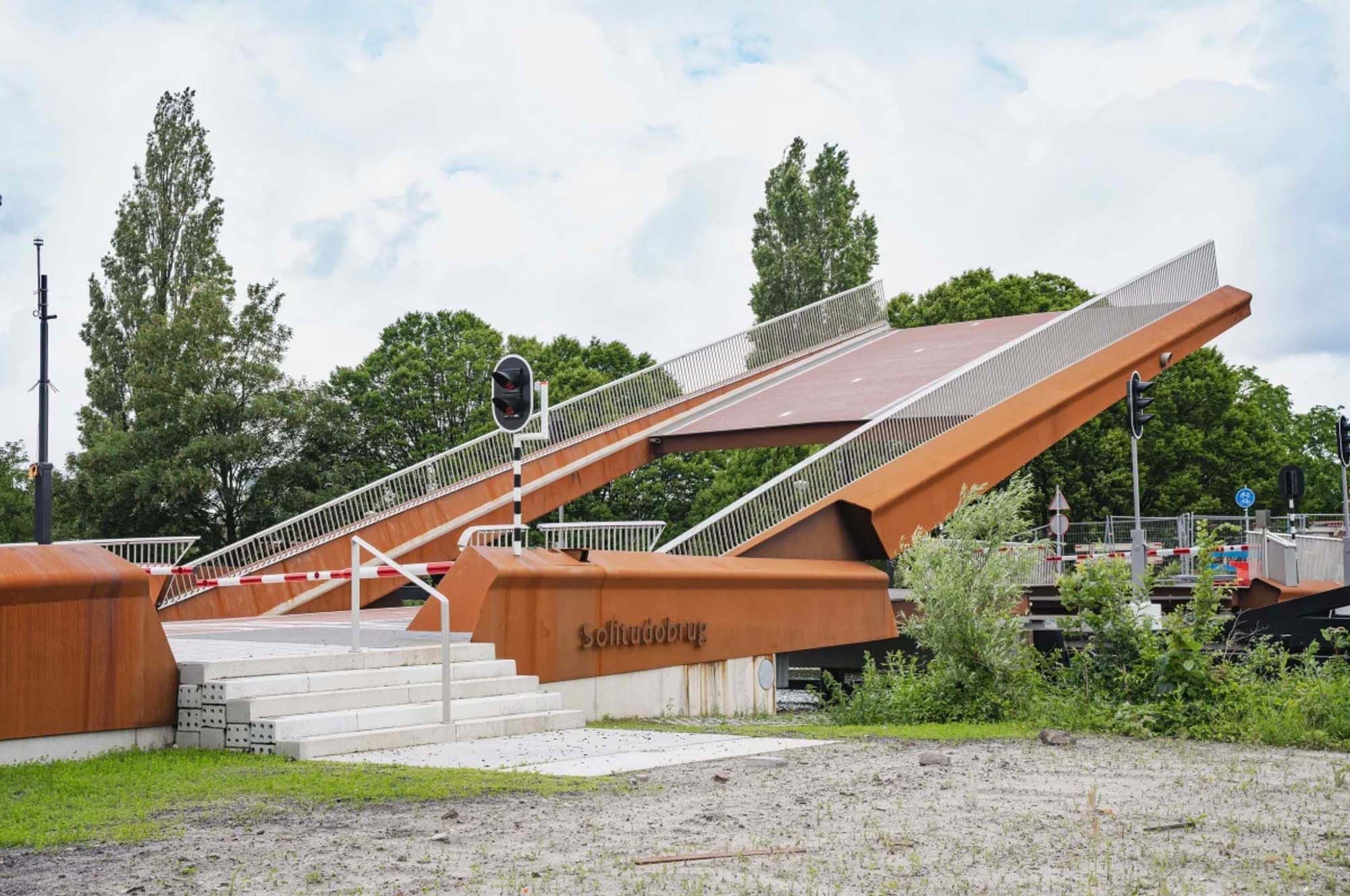La relation avec l'environnement est modeste mais assurée. Le pont relie deux paysages urbains très différents de part et d'autre du canal Vaart à Amsterdam : la zone urbaine surélevée d'Overamstel et le quartier verdoyant et bas d'Amsteldorp. La rive d'Overamstel au nord du pont est constituée de pierres brutes, alors qu'un quai sera aménagé au sud. Le pont se trouve exactement à la jonction entre ces deux types de rives. Notre conception tire au maximum parti de l'asymétrie et de la simplicité. L'apparence du pont est logique, évidente et modeste. Une ligne simple mais puissante naît du parc d'Overamstel, forme une charnière robuste du côté d'Overamstel et s'affine pour devenir un appui extrêmement léger du côté de Weesper. Les approches et les travées se fondent en une seule forme. La structure visible est réalisée en acier auto-patinable, en harmonie avec l'environnement rude. La quasi-totalité de la surface est constituée de tôles d'acier pliées et plates, sans soudures visibles. Ceci contribue fortement à l'impression que le pont forme une seule et même structure. Le pont et le débarcadère constituent un ensemble grâce au parapet continu. Le parapet solide s'inscrit parfaitement dans le thème des zones et des bâtiments fortifiés de la région d'Overamstel. La hauteur de passage des ponts mobiles est généralement illimitée. À cet endroit, une hauteur de passage de 5,5 m suffit. En déplaçant la rotule vers la rive, la hauteur de passage est déjà atteinte avec une ouverture de 18 degrés. Les barrières et les feux de signalisation routière forment ensemble un seul 'meuble'. Les dispositifs de freinage, les piliers et les feux de navigation sont de forme discrète et placés près de l'eau dans une seule couleur. La forme incurvée de la main courante permet à l'éclairage LED de rayonner vers le pont. Les chauves-souris volantes sous le pont ne sont pas gênées par la lumière. La rampe est séparée par galvanisation de la structure principale en acier auto-patinable. Cela permet d'éviter la formation de rouille sur la rampe. La technologie du pont est élégamment dissimulée et protégée contre le vandalisme : le contrepoids, les moteurs et les armoires électriques sont regroupés dans un espace souterrain. Le temps, le vent et les vandales n'y ont pas accès.