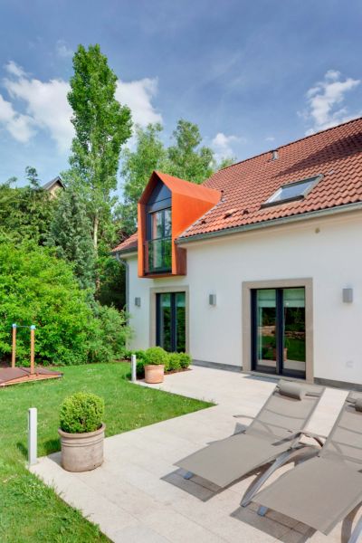 Tekst: <p>Cette maison, située dans le canton de Grevenmacher, s’ouvre avec son pignon vitré vers une grande terrasse et un accueillant jardin, situés parallèlement à la rue. Le maître d’ouvrage souhaitait une solution ‘douce’ comme paravent, c’est-à-dire une solution qui permettrait de conserver l’intimité privée entre la terrasse et la rue, mais sans donner l’aspect d’un mur séparatif austère et froid.<br>Le bureau d’architecture WeB a donc eu l’idée de réaliser un rideau en lamelles verticales avec une simple structure en acier, composée de 126 profilés en L (100 x 50 x 6 mm), laqués en couleur DB 703, d’une hauteur de 3 m. Sur une longueur d’environ 9,5 m, six éléments identiques et une double porte forment le paravent. Les six éléments sont miroités et tournés, ce qui donne un aspect et une forme légèrement ondulée. L’idée d’un rideau en acier est renforcée par les interstices variés qui laissent filtrer les rayons de soleil sur la terrasse. Les jeux d’ombre et de lumière donnent alors l’impression d’un voile flottant.</p>