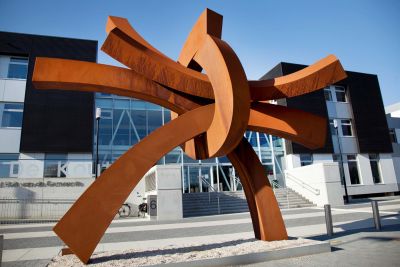 Tekst: <p>Le complexe du nouveau campus à Bruges est recouvert d’une toiture en acier monumentale qui se transforme, le long de la voie rapide, en façade avec bardage en zinc de couleur anthracite. La structure du toit est en acier afin de pouvoir franchir de grandes portées au moyen d’une construction légère. Les fermes en acier - structure en treillis - sont portées par des colonnes en béton assurant la stabilité nécessaire. La structure en acier dans son ensemble mesure 169 m de long, 50 m de large, 24 m de haut et pèse 598 tonnes. Dans la grande cage d’escalier, les poutrelles de toiture et les colonnes font office d’arêtiers, accentuant ainsi la finesse et l’ouverture de ce campus. Cette sensation d’ouverture se retrouve dans la cafétéria, où des arêtiers sont aussi utilisés. Tout le long de l’arrière du bâtiment se trouve un auvent élancé.</p>