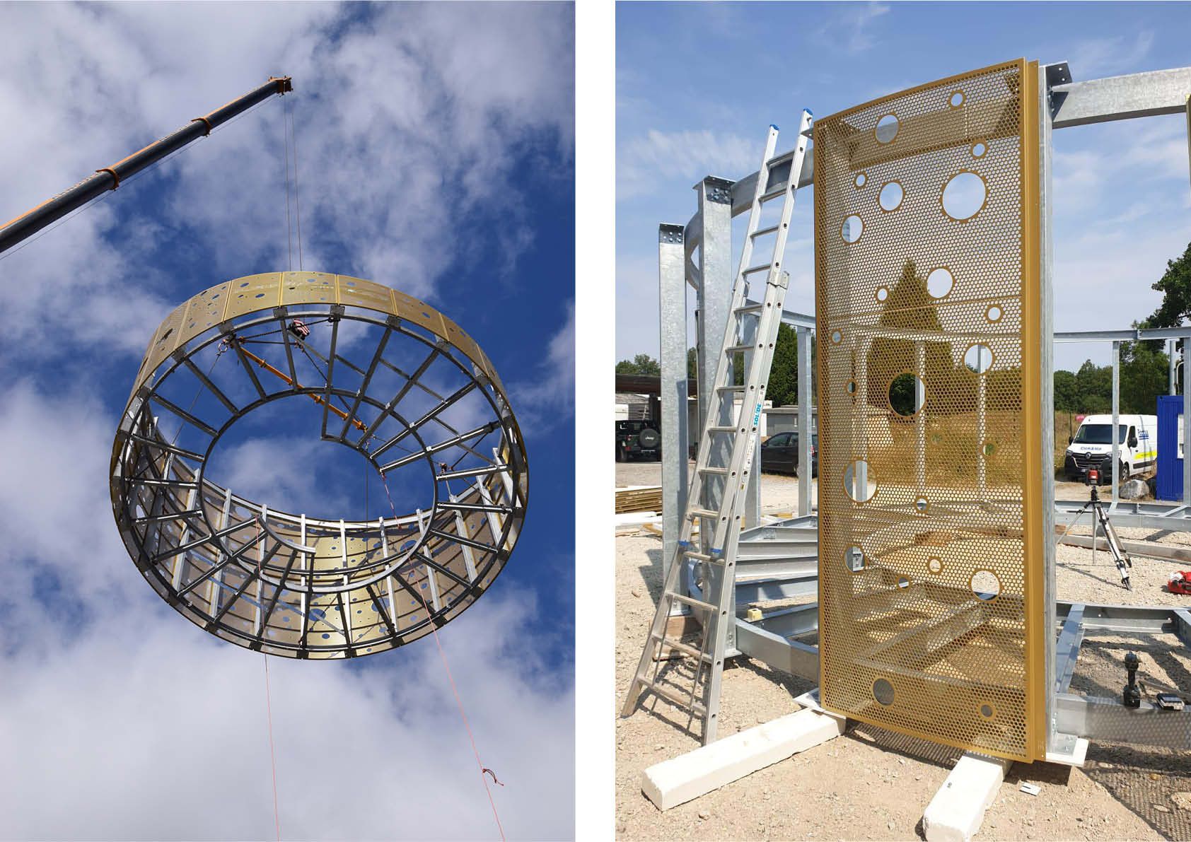 Als dubbelwandige gevel zorgt de geperforeerde beplating voor semitransparantie en een fysieke barrière die hoogtevrees tegengaat en eveneens fungeert als borstwering. De cirkelvormige perforaties met verschillende diameters creëren een wisselend visueel effect en bieden een uitzicht op specifieke delen van de horizon.