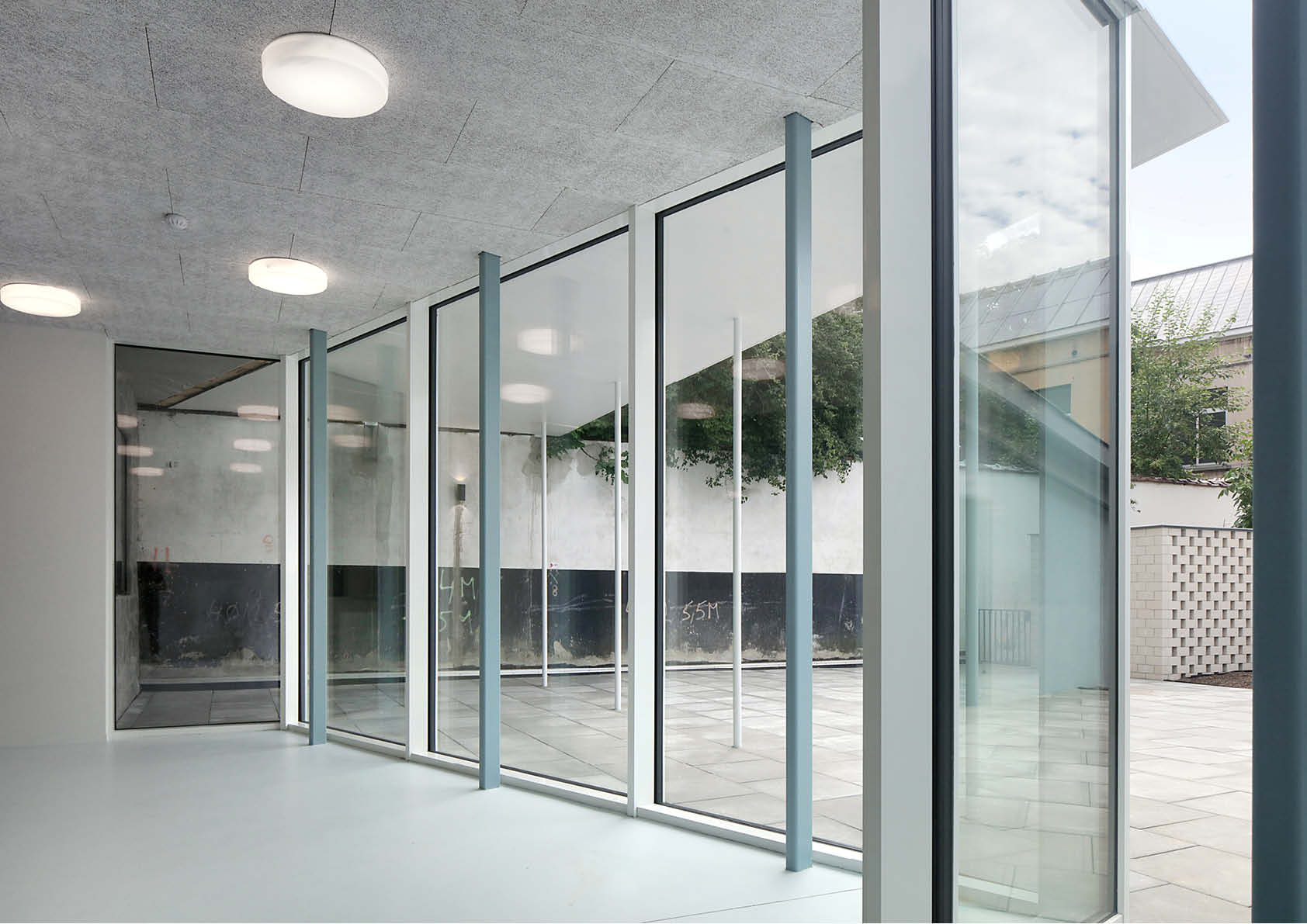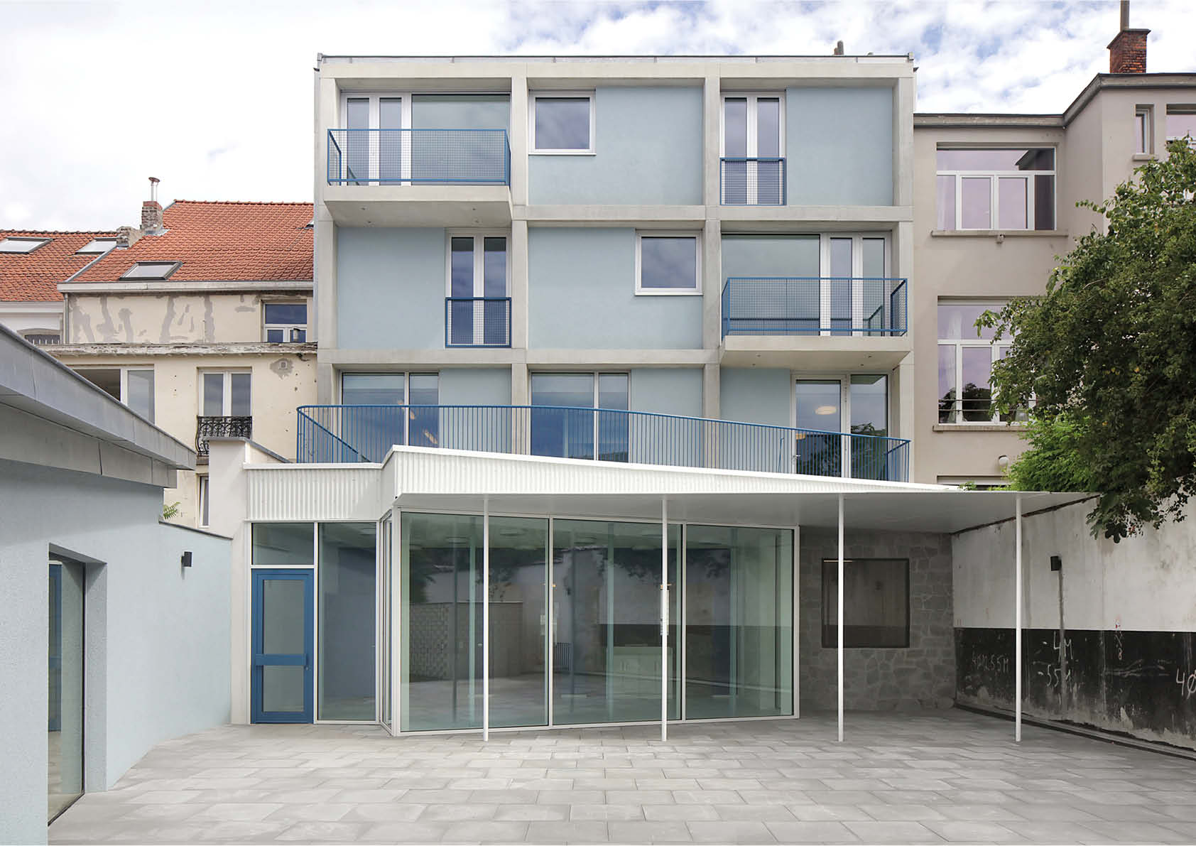 Er werd voor een dubbele strategie gekozen: enerzijds het uitpuren van het terrein en het zorgen voor een maximum aan licht; anderzijds het introduceren van een nieuwe structuur van open ruimtes en gebouwen. De nieuwe gebouwen worden in eenzelfde typologie opgevat, met name open tuinpaviljoenen van één niveau. Alle geveldelen en ruimtelijke elementen van de publieke ruimte werden in dezelfde staalelementen uitgevoerd. Het gebouw wordt gedragen door lichtblauw gelakte stalen kolommen. Een fijne luifel in staal markeert de relatie onderling en met de publieke ruimte.