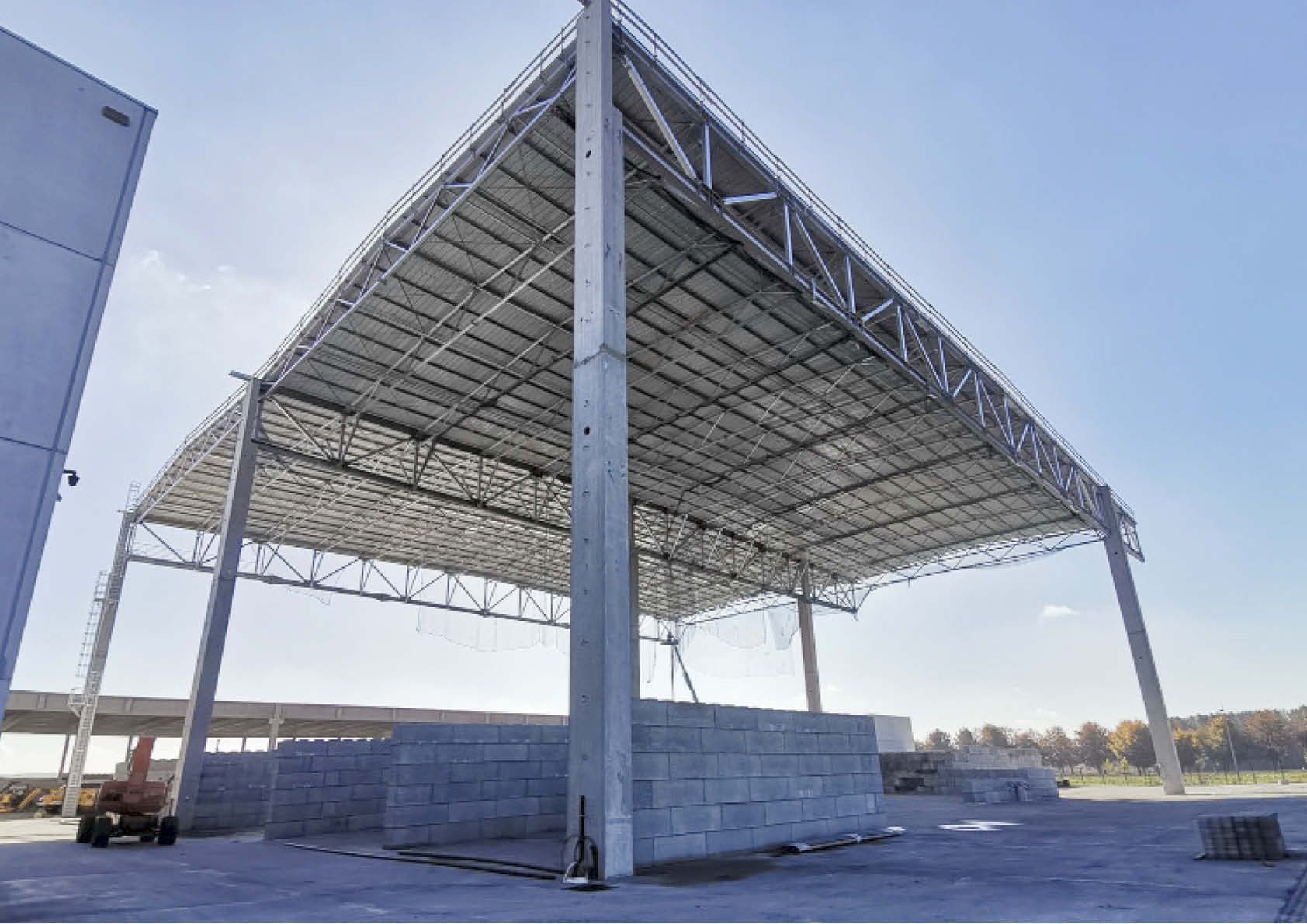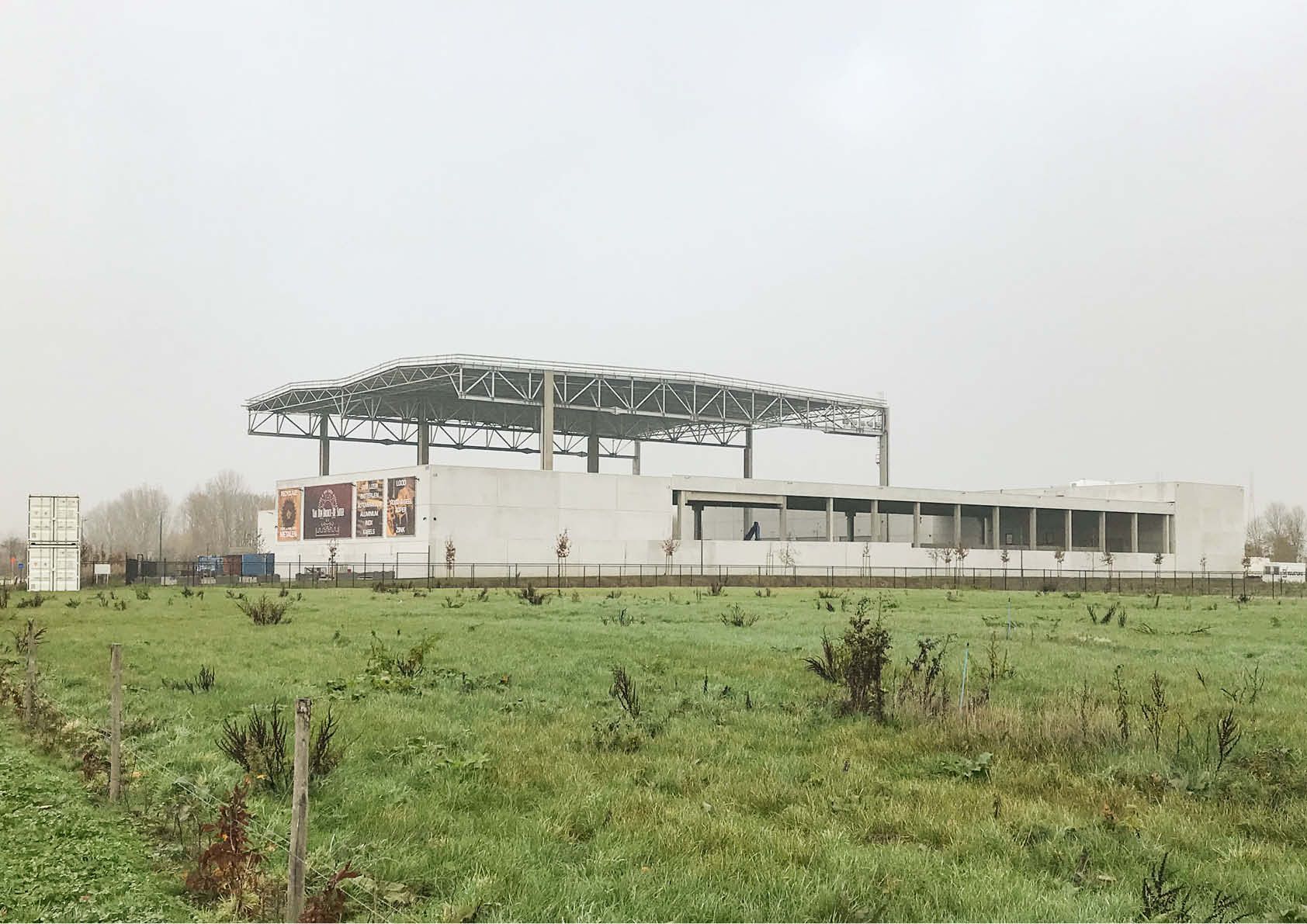 Een stalen luifel, steunend op 6 betonnen kolommen, overdekt de twee circulatieassen en is de eyecatcher van het ontwerp. Het project heeft een industriële uitstraling met een paar speelse elementen.